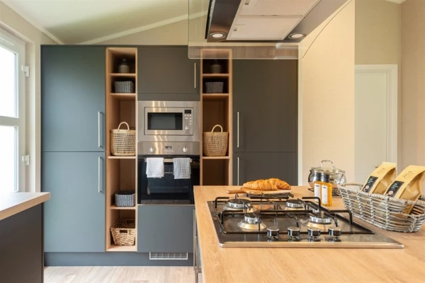 Kitchen/Dining: Vaulted ceilings, matt grey kitchen units, dining table and chairs, feature light fittings to dining area, oak effect worktops, electric single eye level oven, four burner gas hob, integrated fridge/freezer, microwave oven, dishwasher and washing machine
